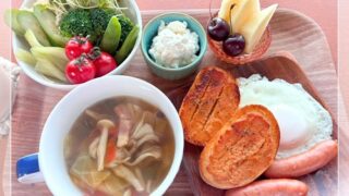 コストコ購入品だらけの朝ごはん記録 メニセーズプチパンをガーリック明太トーストにして、目玉焼きとウインナー、野菜サラダ、きのこベーコンのコンソメスープ、果物と水切りヨーグルトを添えました