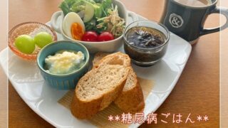2型糖尿病の50代が食べた《糖尿病ごはん》モーニングの記録。ライ麦パンのフレンチトーストを豆乳とラカントで作り、野菜スープやミックスビーンズサラダを添えて、トータル約550〜600kcalに収めた朝ごはん例です。