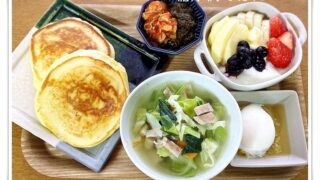 糖尿病を患っている管理人の糖尿病朝ごはんです。鮭や納豆、キムチ、モズク酢、豚汁に野菜サラダも併せて白米は少な目のバランスを考えた献立にしました。